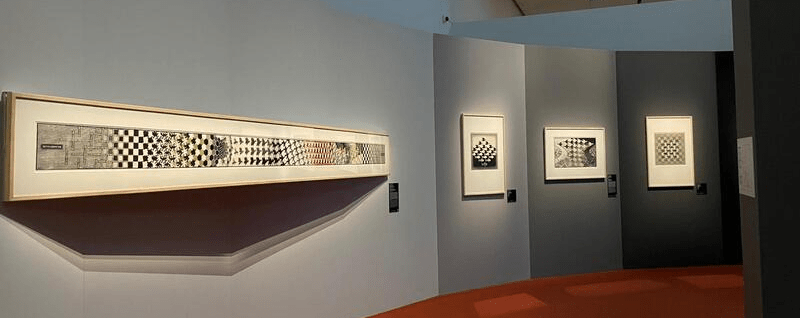 Nelle sale, si esplorano i rapporti dell’incisore con altre due fonti d’ispirazione. La prima è l’Italia, con vedute di Roma, della Costiera amalfitana, dell’Etna, della Calabria, e non solo. Escher filtra questi paesaggi col suo genio grafico da incisore: li trasforma geometrizzandoli, così da intersecare linee e piani, prevalentemente in bianco e nero. Ma il suo interesse non è la sola staticità del paesaggio, bensì il divenire, inteso come trasformazione: la progressiva astrazione mediante la tassellazione (“in geometria, configurazione costituita da poligoni che ricoprano l’intero piano, senza sovrapporsi a due a due”, Treccani.it) permette all’artista di costruire sequenze di immagini raccordate da un procedimento di scomposizione. In questo senso, “Metamorfosi II” (in mostra) è esemplare: da una scacchiera si passa alla veduta del borgo salernitano di Atrani, per poi approdare a figure di animali (pesci e rettili), insetti (delle api e un alveare), geometrie e, di nuovo, una scacchiera.