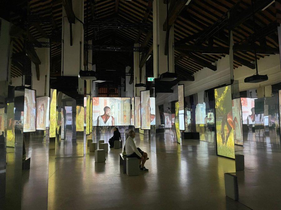 Un piccolo schermo all’ingresso indica a che punto è arrivata la riproduzione. Conviene aspettare l’inizio del cortometraggio prima di entrare nelle Fruttiere di Palazzo Te, che riaprono proprio in occasione dell’installazione di Isaac Julien “All That Changes You. Metamorphosis” (fino al 31 maggio). Grandi schermi e specchi riproducono sequenze di un film di circa 20 minuti, realizzato dal regista inglese per i 500 anni di Palazzo Te a Mantova. Ad alcuni affreschi del palazzo sono dedicate sequenze del film, che combina ambienti e presenze diversissime: la postmoderna Cosmic House di Charles Jencks a Londra; le foreste del Redwood National and State Park in California; un modello di astronave in vetro, progettata da Richard Found, nelle campagne inglesi; luminescenti animali marini; il padiglione per la Kramlich Collection di media art realizzato dallo studio di architettura svizzero Herzog & de Meuron. Le protagoniste sono le attrici Gwendoline Christie e Sheila Atim, presenze eteree che si aggirano nei diversi ambienti. Compaiono anche riferimenti letterari: un cammeo della filosofa Donna Haraway, che legge brani dal suo Staying with the Trouble; le storie delle due protagoniste, che si rifanno a due romanzi di fantascienza, Memoirs of a Spacewoman (Naomi Mitchison) e Parable of the Sower (Octavia E. Butler).